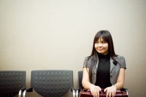 asian businesswoman sitting alone in a waiting room for an appointment