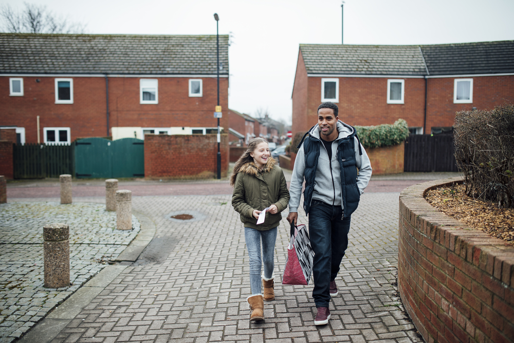 Little girl and her father are returning home from a trip to the shops.